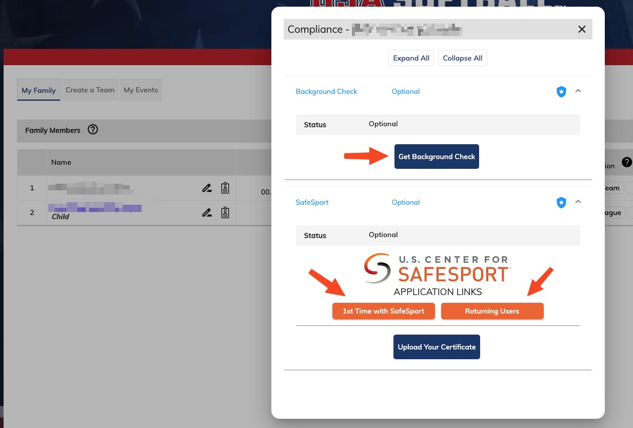 SafeSport Signup links are now visible on the Compliance screen for all adults, regardless of coaching status.